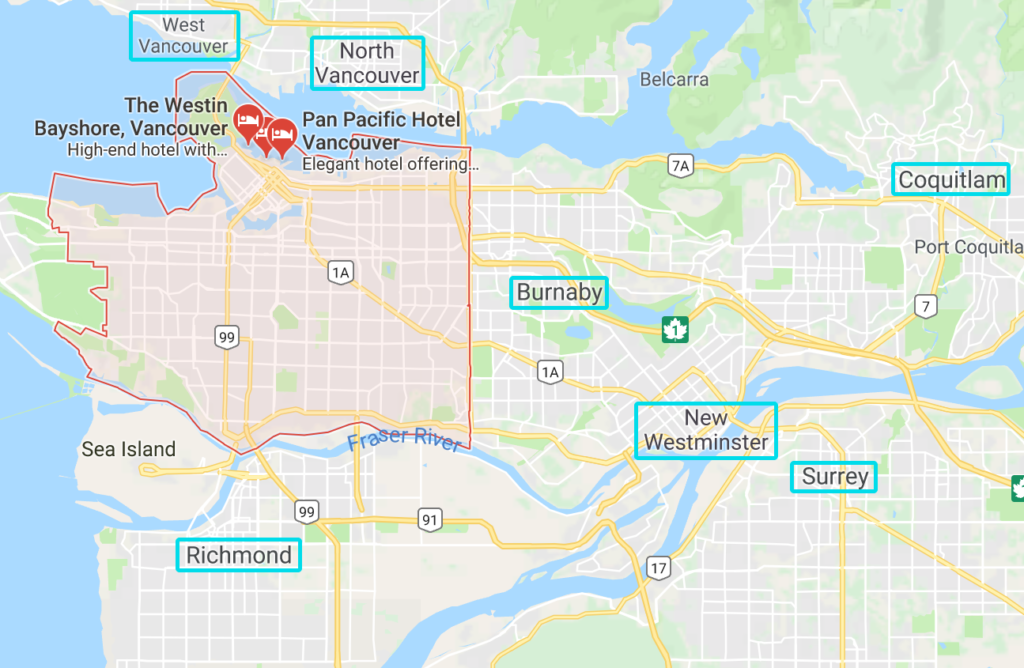 赤く塗られた範囲がバンクーバー市です。
